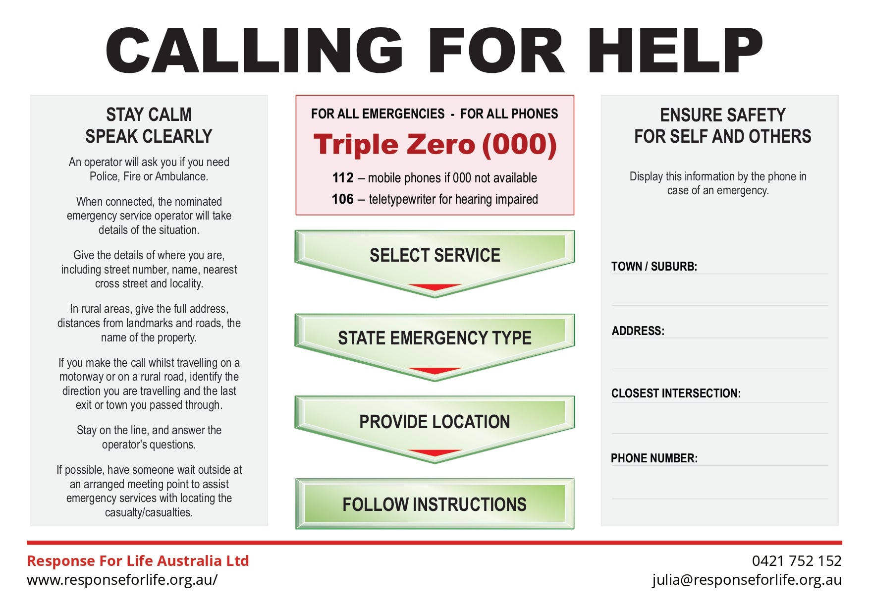 Free First Aid Chart | A clear, step-by-step guide to calling 000 and requesting emergency assistance when every second counts.