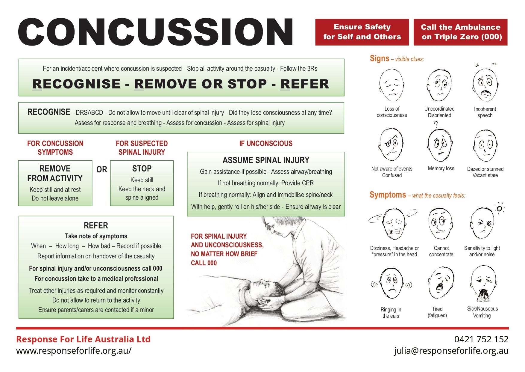 Free First Aid Chart | Learn the 3 R's when a concussion happens.