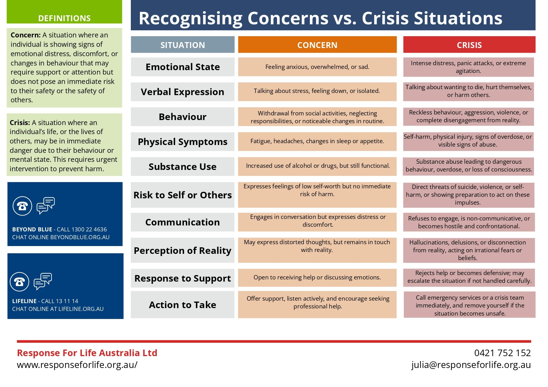 Free First Aid Chart | A supportive reference chart to help recognise warning signs versus crisis indicators.