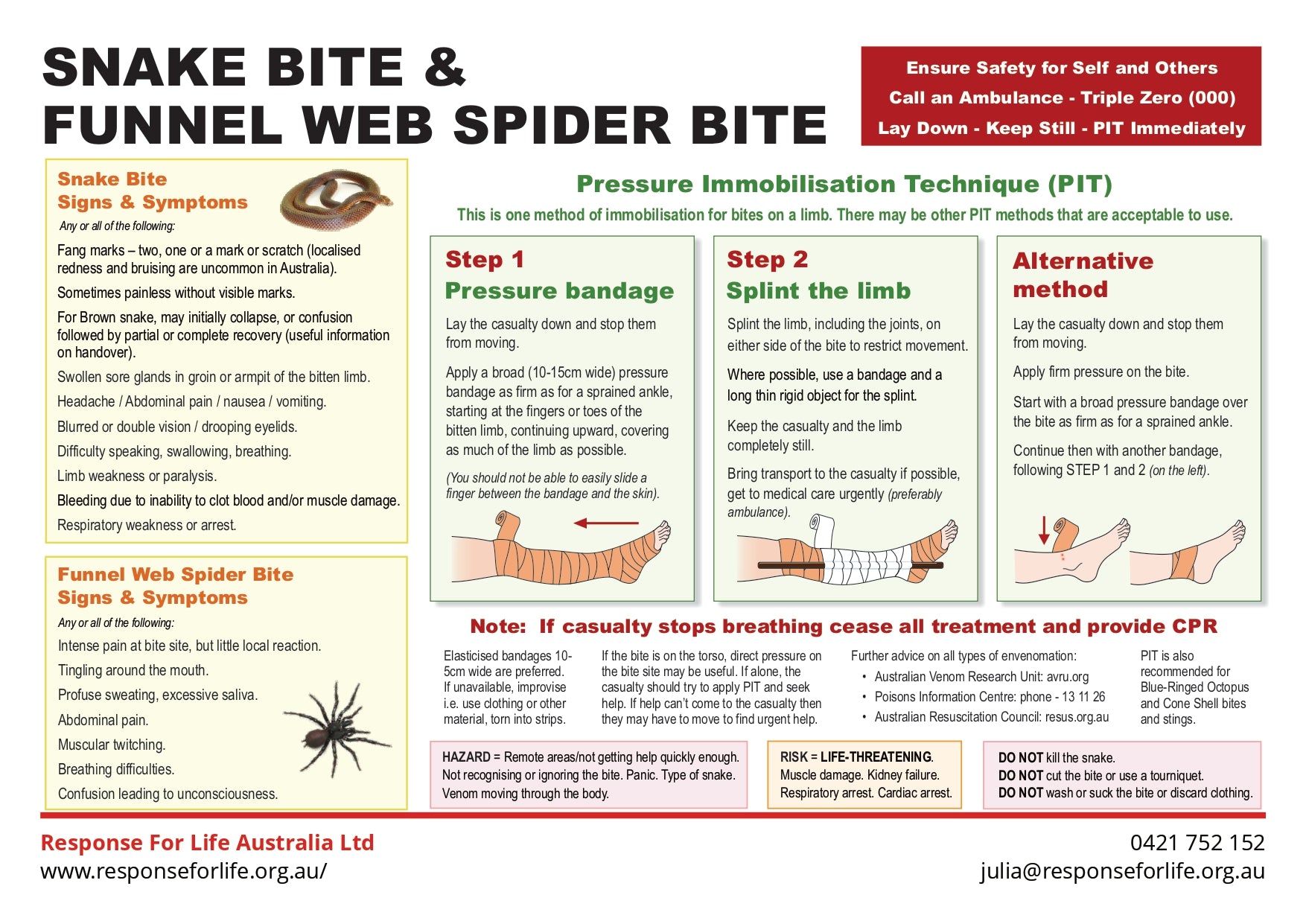 Free First Aid Chart | First aid for snake and funnel-web spider bites, including the PIT and further envenomation advice.