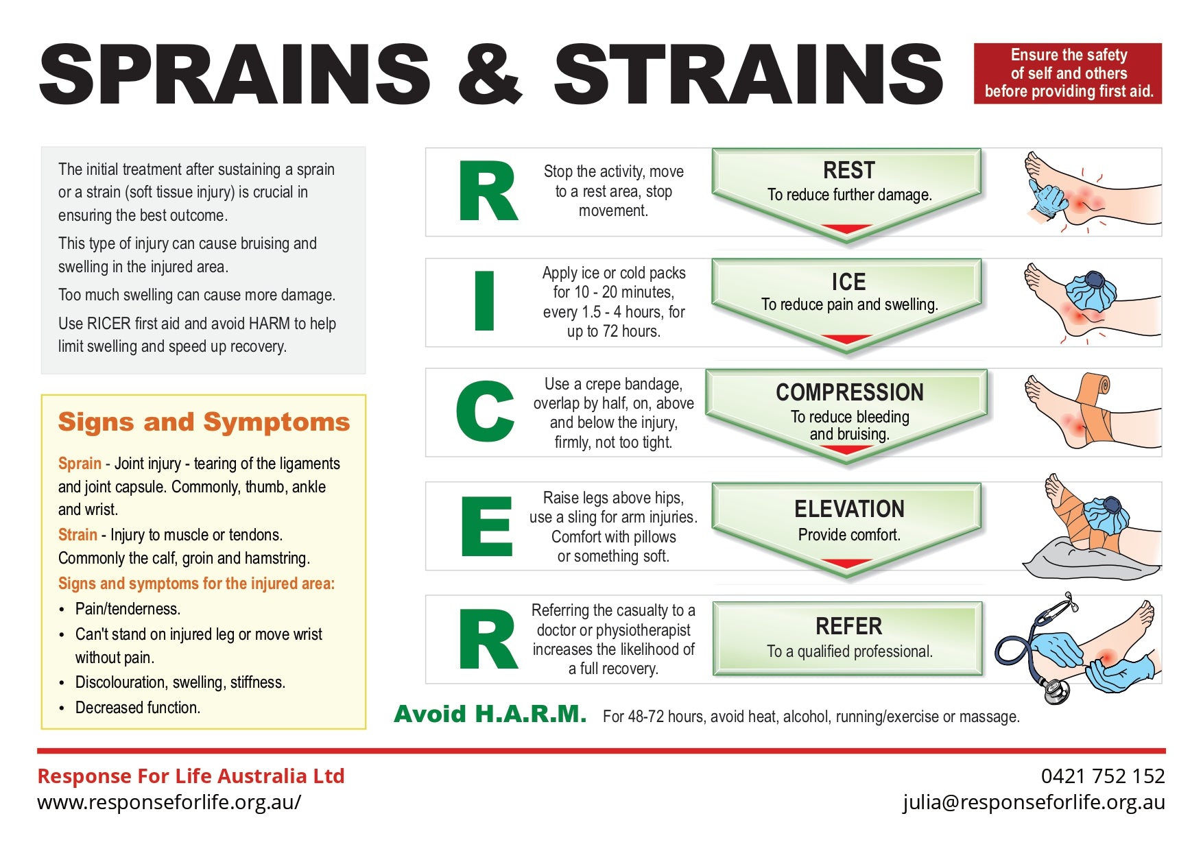 Free First Aid Chart | Learn the signs and symptoms of sprains and stains, manage using RICER and avoid HARM.