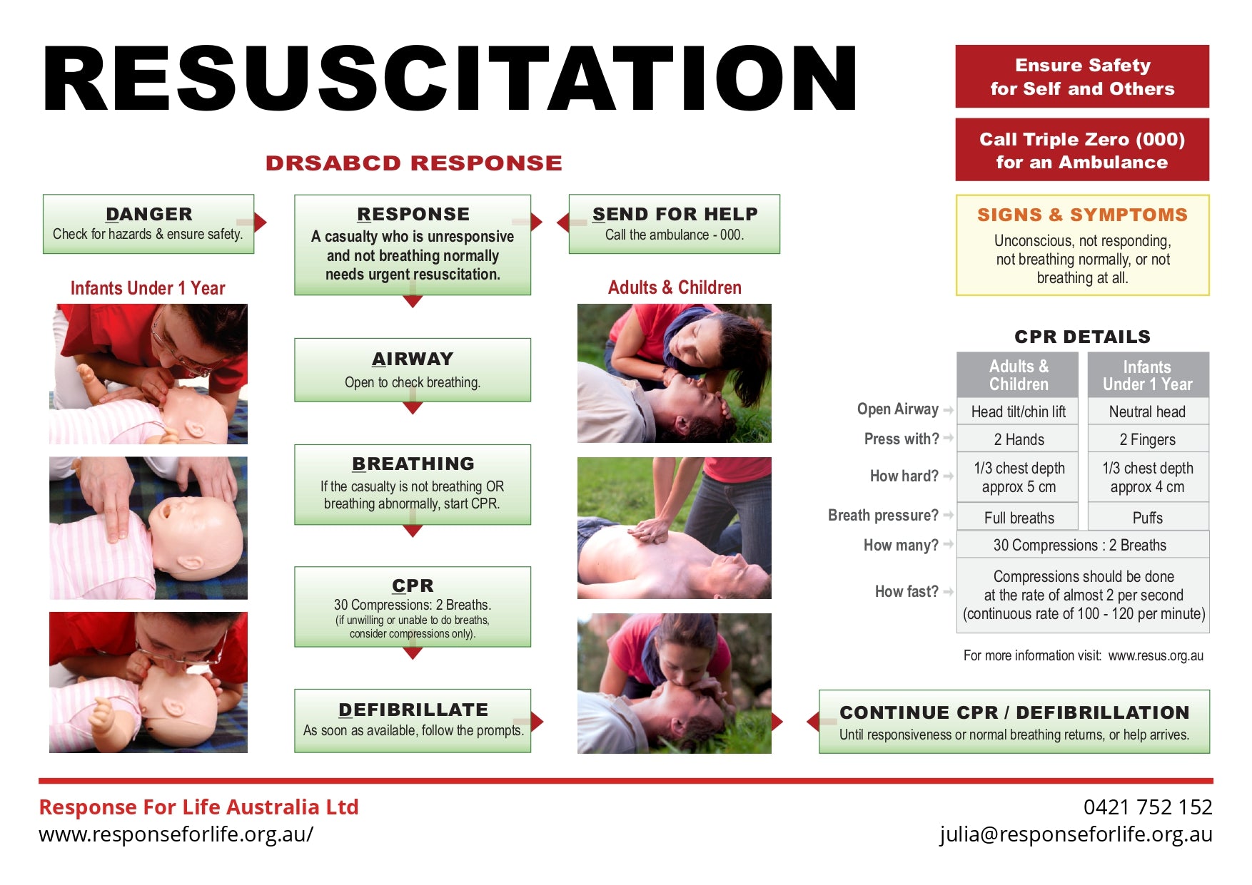 Free First Aid Chart | Step-by-step CPR and resuscitation guide covering DRSABCD for adults, children, and infants.